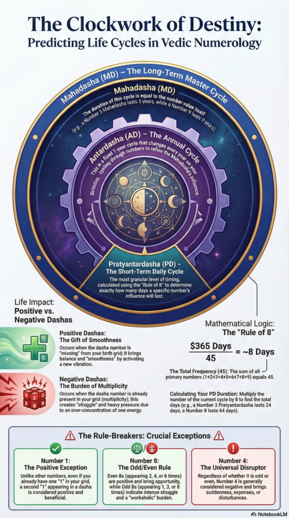 Vedic Numerology teaches us that life isn’t just about what is in your grid, but when it arrives. By understanding your Mahadasha, Antardasha, and the daily “Rule of 8,” you can prepare for the storms and maximize the sunny days.